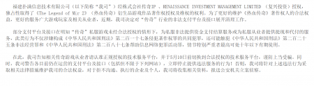 福建撲滿信息技術有限公司注冊地位于福建省福州市,是國內(nèi)《熱血傳奇》客戶端游戲獨占性版權人。對《熱血傳奇》客戶端游戲擁有全部版權,并有權基于版權權利進行該游戲維權。株式會社傳奇IP (以下簡稱傳奇IP )對《The Legend of Mir 2》(中文名為“熱血傳奇"、或“傳奇”、“傳奇2”、“MIR II”)游戲(以下稱為 “授權作品”) 共同享有充分、完整且有效的著作權。經(jīng)傳奇IP授權 , RENAISSANCE INVESTMENT MANAGEMENT LIMITED (以下簡稱 RENAISSANCE Ltd.)有權在中國大陸地區(qū)獨占性地對授權作品的網(wǎng)絡客戶端游戲進行開發(fā)、 發(fā)行、管理、宣傳、推廣和運營,針對授權作品的侵權游戲及侵權方,RENAISSANCE Ltd.有權采取必要的措施,并有權將前述權利分授權給第三人。福建撲滿信息技術有限公司經(jīng)RENAISSANCE Ltd.授權,獲得上述權利,有權在中國大陸地區(qū)獨占性地對授權作品的網(wǎng)絡客戶端游戲進行開發(fā)、發(fā)行、管理、宣傳、推廣和運營,并有權對侵權行為/主體采取維權措施。